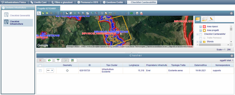 L'elenco dei cluster creati sarà visualizzabile in "Checklist Infrastruttura". I Cluster creati saranno categorizzati in base al fatto che siano costituiti da infrastrutture esistenti o nuove: tale dato verrà riportato nella colonna "Tipo Infrastruttura".